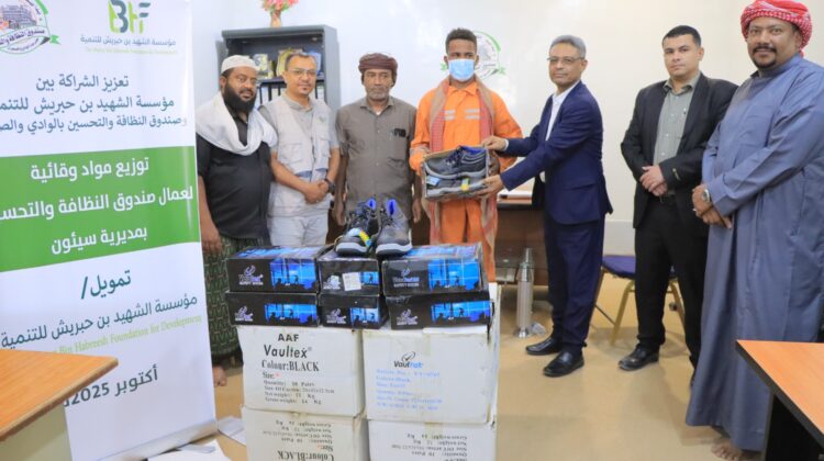 وخلال التدشين بحضور مدير عام صندوق النظافة والتحسين بحضرموت الوادي والصحراء الأستاذ مرعي فضل الكثيري، ونائبه للشئون الفنية المهندس علي بارجاء ومدير وحدة النظافة والتحسين بمديرية سيئون الشيخ شوقي الدباء والقائم بأعمال المدير التنفيذي للمؤسسة المهندس خليل بن منيف والمسئول المالي بالمؤسسة زكي بن سعد، عبر مدير عام الصندوق الكثيري، عن خالص شكره وتقدير لمؤسسة بن حبريش لتدخلاتها ودعمها المتواصل للصندوق، مشيرا ان ما تم تدشينه اليوم كمبادرة من مؤسسة BHF الى مهندسي النظافة بسيئون جاء في الوقت المناسب كونهم بأمس الحاجة واكثر عرضة للإصابة خلال رفع المخلفات ووقايتهم من الإصابات والامراض المعدية.